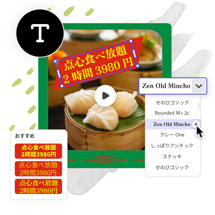 Adobe Expressのオンライン動画編集機能は永久に無料で使用でき、動画編集の経験のない方でも魅力的な写真動画を作れます。カスタマイズ可能な無料動画テンプレートに写真を追加したり、テンプレートを使わず、白紙の状態からデザインしたりできます。テキストを動画に追加すると、そのデザインにおすすめのフォントが表示されます。編集が終わったら、かんたんに動画のサイズを変更して、いろいろな方法で共有しましょう。