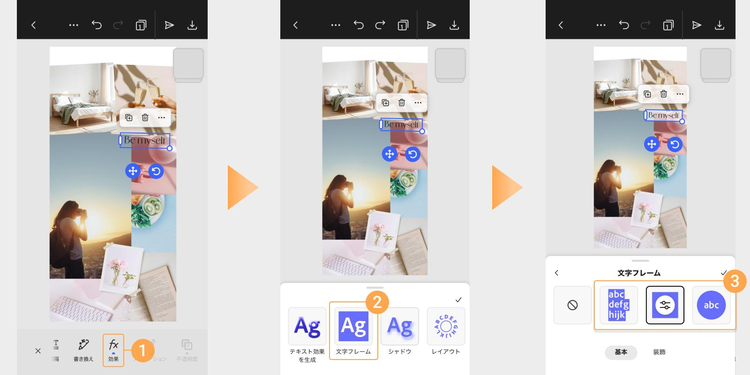 テキストボックスを選択し、「効果」>「文字フレーム」の順にタップして、好みのスタイルや色を指定してください。