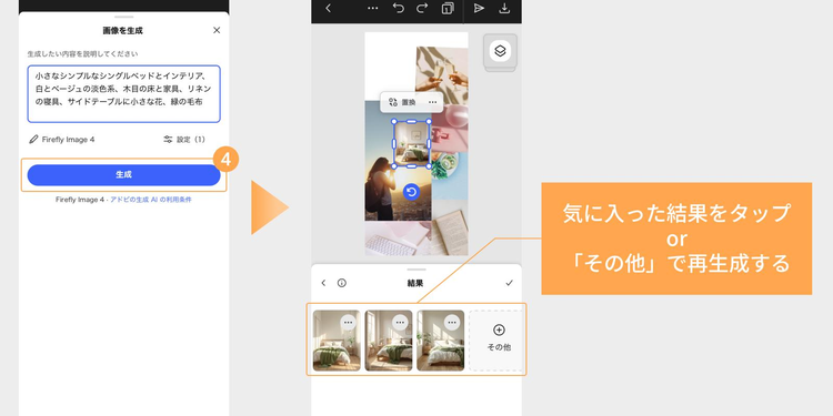すると、生成結果が4つ表示されるので、気に入ったものを選んで配置してください。