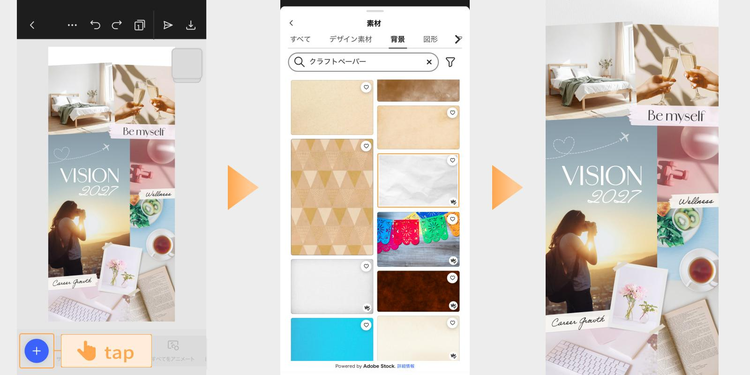 背景画像を追加するには、「+」ボタン>「素材」>「背景」を順にタップし、検索窓にキーワードを入れてイメージに近いものを探します。