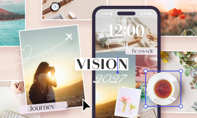 テキストでなりたい姿や目標を加えると、ビジョンがひと目でわかりやすい1枚に近づきます。また、画像と画像の境目にテキストを配置したことで、全体のつながりが自然になり、ツギハギ感のない美しい仕上がりになりました。
