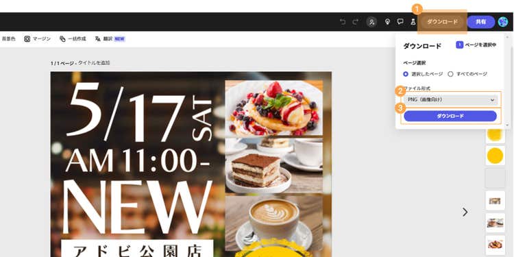 デザインが完成したら「ダウンロード」をクリックし、ファイル形式を選択してダウンロードしましょう。今回はwebバナーを想定しているので、JPGやPNG形式を選択します。
