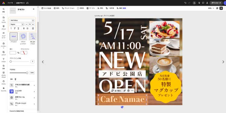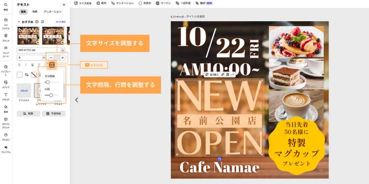 同様に日付や時間、カフェの名前のフォントを変更します。文字サイズ、文字間隔、行間を調整して、テキストを編集しましょう。