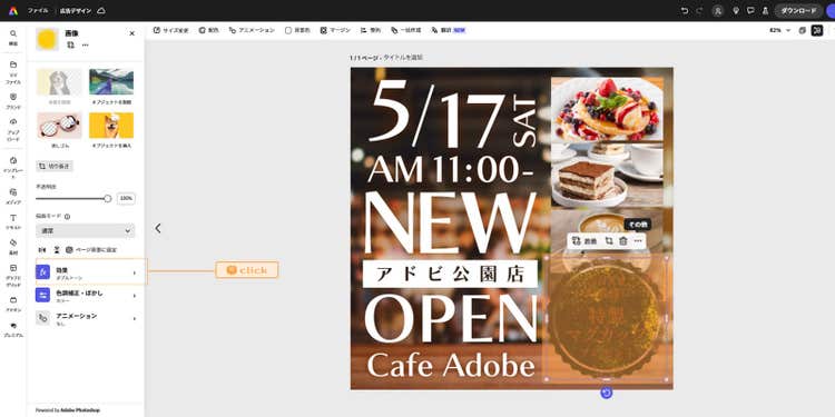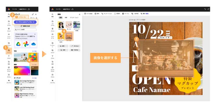 ここからはPCブラウザ版の「Adobe Express」を使い、カフェの新規オープンを告知するバナーの作り方を解説します。Adobe Expressのモバイルアプリを使えば、スマホやタブレットからデザインすることも可能です。