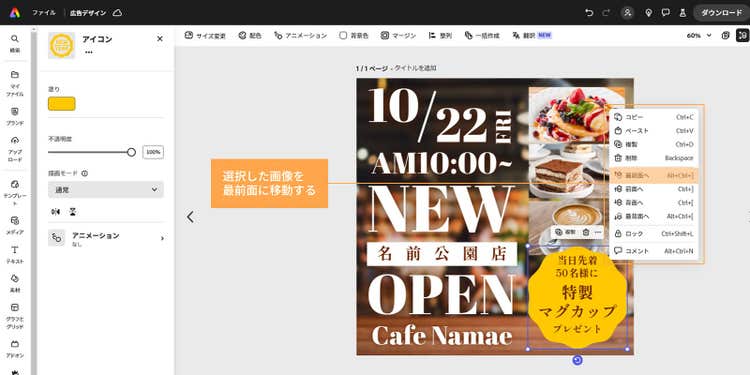 今回はこちらのテンプレートを使用して、カフェの新規オープンを告知する広告デザインを作っていきます。