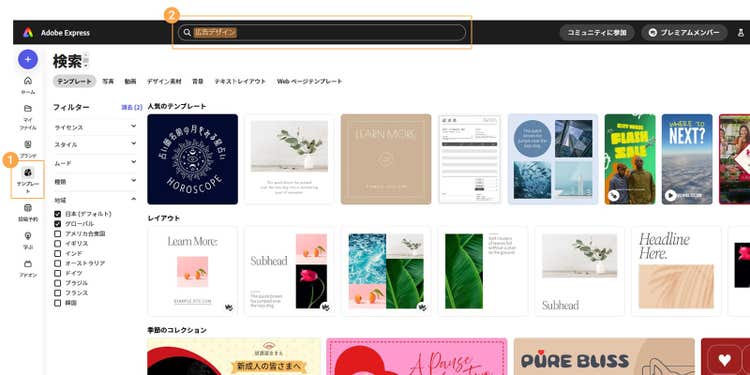 次は、Adobe Expressのテンプレートで広告デザインを作る手順をご紹介します。テンプレートを活用すれば、手軽に魅力的な広告を作成できるので、ぜひ参考にしてください。