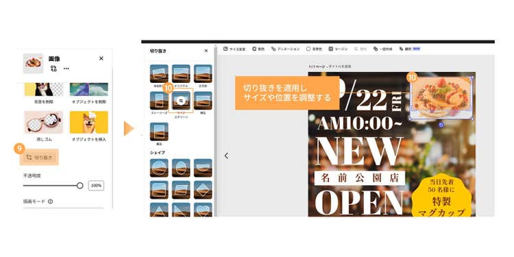 追加する写真を選んだら、「切り抜き」で必要な箇所だけを表示させます。併せてサイズを調整し、好みの位置に配置します。