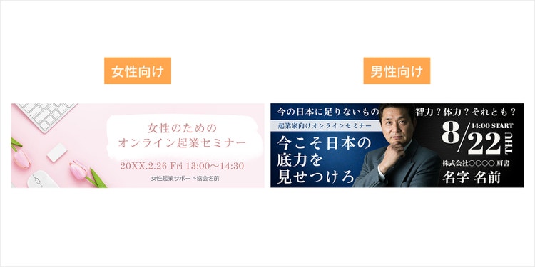 たとえば、起業を目指す女性向けのセミナーであれば、パステルピンクやベージュなど優しい雰囲気のカラーを使い、経営者向けのセミナーであれば、ゴールドやロイヤルブルーなど高級感や落ち着きのあるカラーを選ぶなどします。