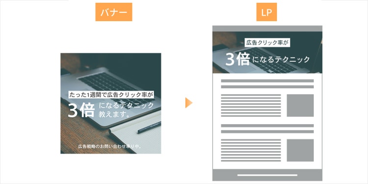 バナーのフォントやカラー、テイストはリンク先のLPのデザインに合わせましょう。バナーとリンク先のデザインが大きく異なると、ユーザーが意図しないページに飛んだと勘違いし、離脱してしまう可能性が高まります。また、バナーとLPに統一感がないと、洗練されていない印象をユーザーに与えて、信頼感・安心感を損ねてしまう場合もあります。