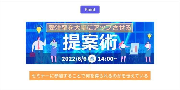 対象者のセミナーへの参加意欲が高まるのは、そのセミナーに参加するベネフィットがわかったときです。そのため、自社がそのセミナーで提供できるベネフィット(便益・恩恵)も必ずバナーに記載しましょう。
