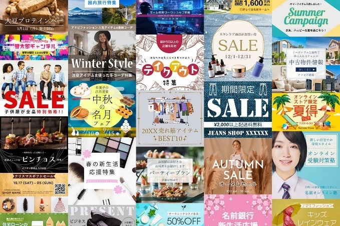 それぞれの業種で使いやすいテンプレートを選べば、魅力的なキャンペーンバナーをカンタンに作成できます。 テンプレートのデザインや画像をカスタマイズしたり、自前の画像を追加したりして、オリジナリティーあふれるバナーデザインに仕上げましょう。