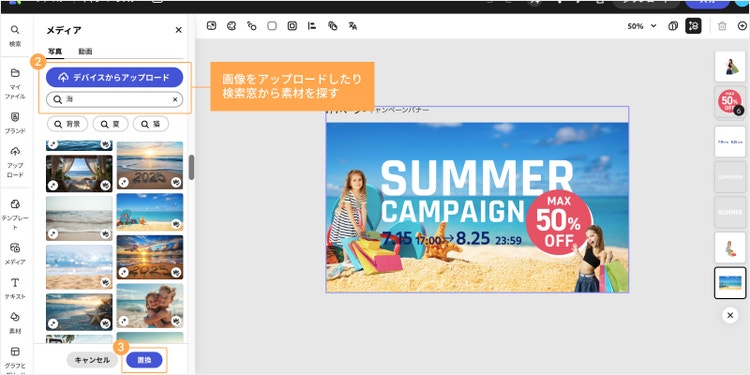 ほかにも、左側の「デザイン素材」や「メディア」からイメージにあった素材を挿入し、選択したのち、ツールバーで「ページ背景を置き換え」をクリックすると、自動で背景が変更されます。 背景画像でバナーの印象がガラリと変わるため、いろいろな素材を試してみるのもよいでしょう。
