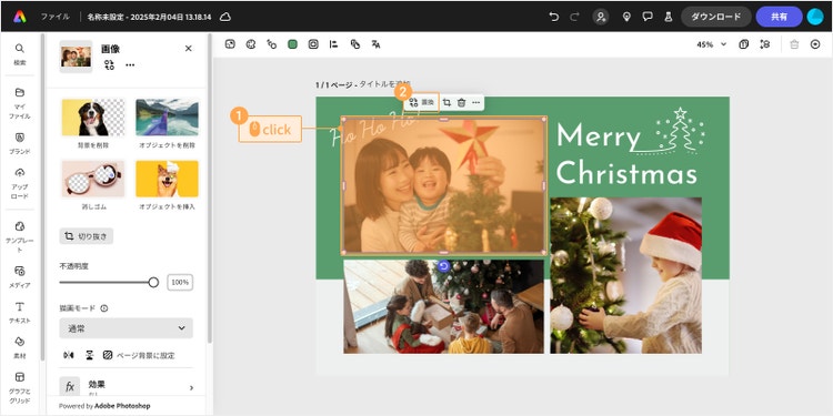 まずはテキストから編集してみましょう。今回はこちらのテンプレートをアレンジして、クリスマスカードを作成していきます。