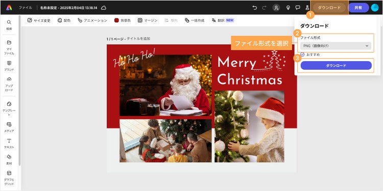 デザインの最終調整が済んだら、画面右上の「ダウンロード」をクリックし、ファイル形式を選んで画像をダウンロードしましょう。