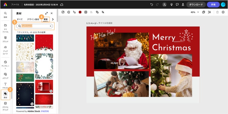 また、Adobe Express内の素材を背景画像として使いたい場合は、画面左側の「素材」をクリックしましょう。「背景」タブから気に入ったデザインを選んで、テンプレートのイメージを変更してみてくださいね。