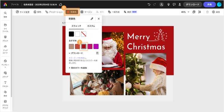 画面上部の「背景色」をクリックします。「おすすめ」や「別のカラーを追加」のカラーパレットから、イメージと近い色を選んでみましょう。