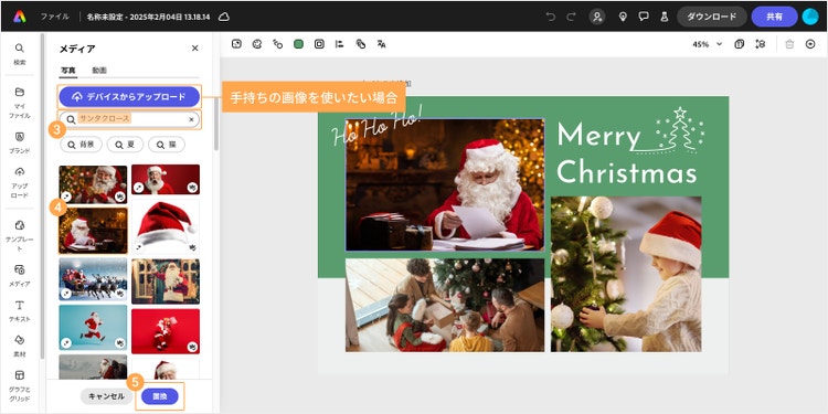 手持ちの画像を使いたい場合は、既存画像をクリック後「デバイスからアップロード」を選択してください。今回は検索窓にキーワードを入力して画像素材を探してみました。好みの素材をクリックするとカンタンに画像を差し替えられます。