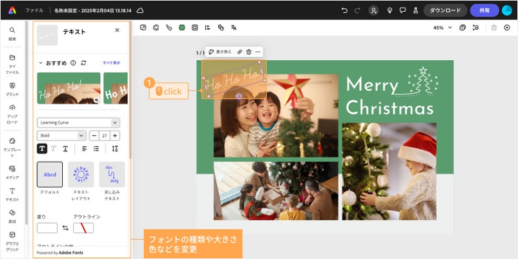 テンプレート上のテキストボックスを選択すると、テキストを変更できます。フォントの種類や大きさ、色などを変えたい場合は、テキストを選択した状態でツールバーから編集可能です。