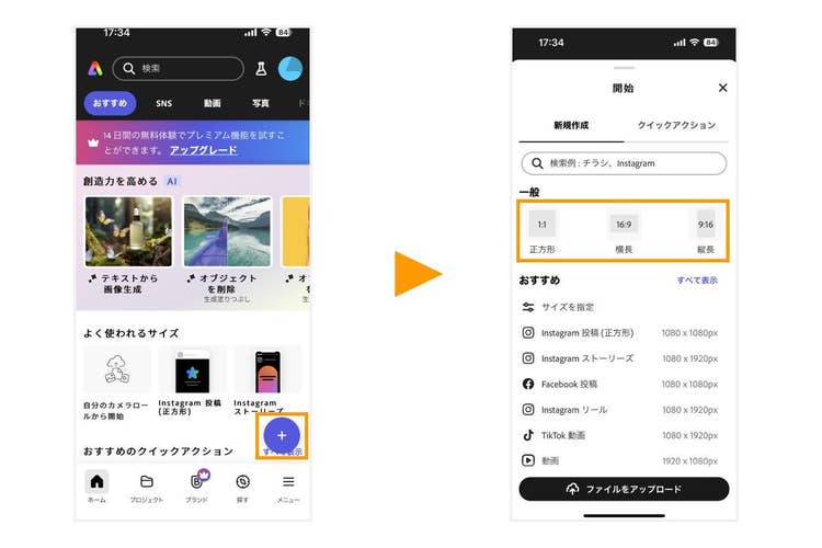 まずはアプリのホーム画面の「+」ボタンをタップし、カンバスサイズを指定しましょう。具体的なサイズが決まっていない場合は、「正方形」「横長(16:9)」「縦長(9:16)」から選んでみてください。