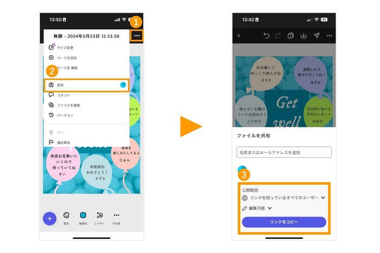 共有機能を使うには、画面右上の「…」から「招待」を選びます。公開範囲を「リンクを知っているすべてのユーザー」・「編集可能」に設定し、「リンクをコピー」をタップすると、共有リンクをコピーできます。メンバー間でリンクを共有すれば、寄せ書きもカンタンです。