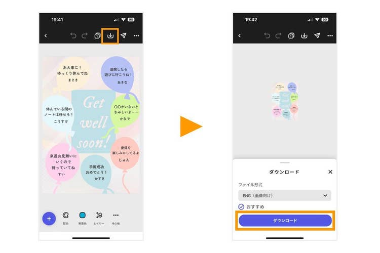 メッセージカードが完成したら保存しましょう。上部のダウンロードアイコンを押すと、ダウンロード画面が表示されます。画像形式を選択したら「ダウンロード」ボタンをタップしてください。