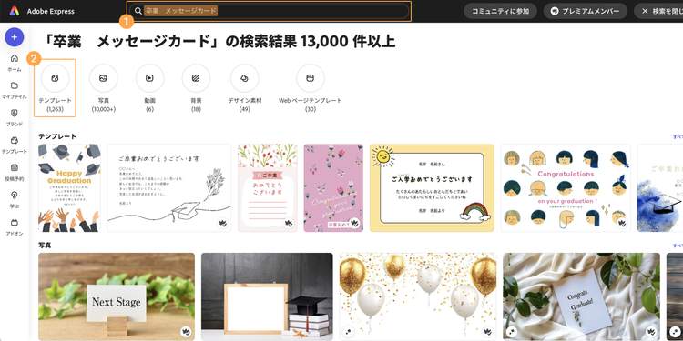 検索窓 に「卒業 メッセージカード」と入力し、「テンプレート」をクリックしましょう。