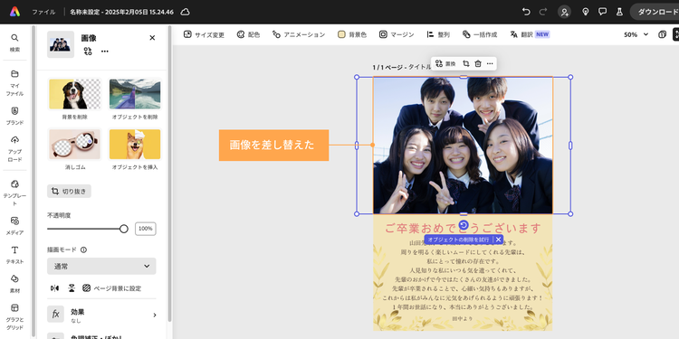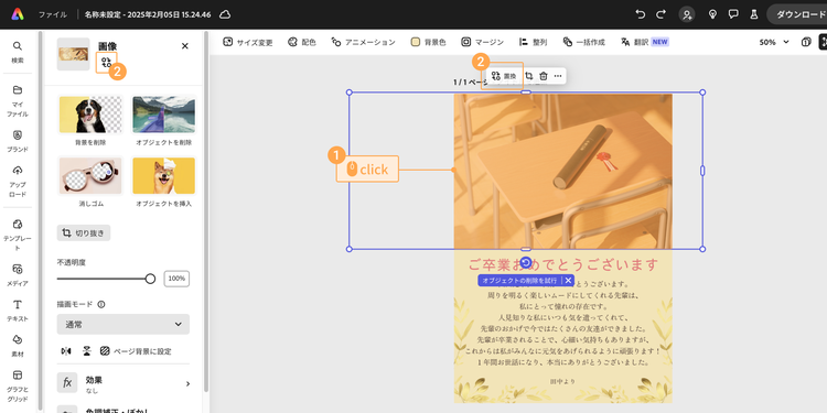 テンプレート内の画像を変更するには、既存の画像を選択した状態で「置換」マークをクリックします。