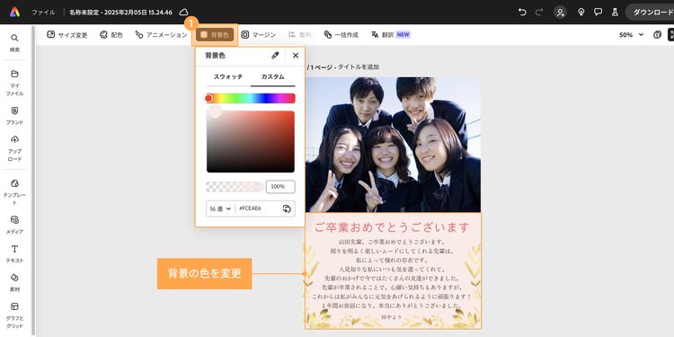 上部の「背景色」をクリックすると、背景色の編集ツールが表示されます。メッセージカードのイメージに合う背景色を、「おすすめ」の色から選んだり、「カスタム」や「別のカラーを追加」で色を指定したりしましょう。