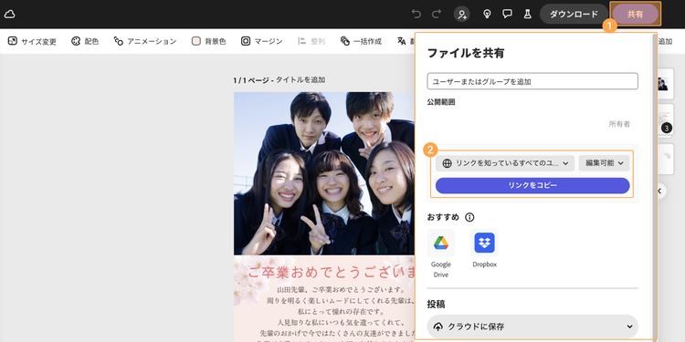 なお、複数人で寄せ書きする場合には、Adobe Expressの共有機能が便利です。