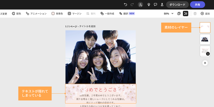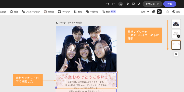 このとき、選択した素材が一番手前に配置され、テンプレートの文字やデザインが隠れることがあります。画面右側にあるレイヤーを上下に移動させて、重なる順序を調整しましょう。