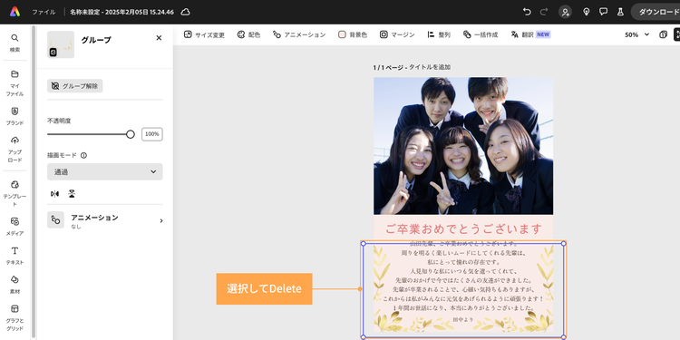 続いて、卒業祝いのメッセージの例文をご紹介します。先にAdobe Expressでテンプレートを編集する方法を知りたい方は、こちらをクリックしてください。