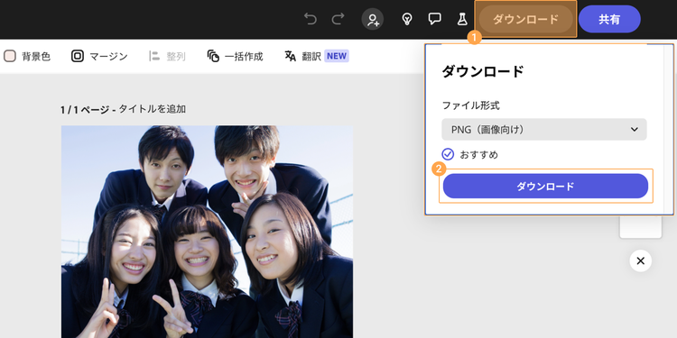 デザインが完成したら、画面右上の「ダウンロード」をクリックし、ファイル形式を選んで画像をダウンロードしましょう。