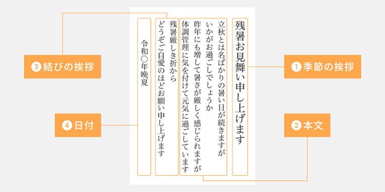 まず、残暑見舞いに書く内容を押さえておきましょう。一般的な残暑見舞いは、季節の挨拶、本文、結びの挨拶、日付に分かれます。