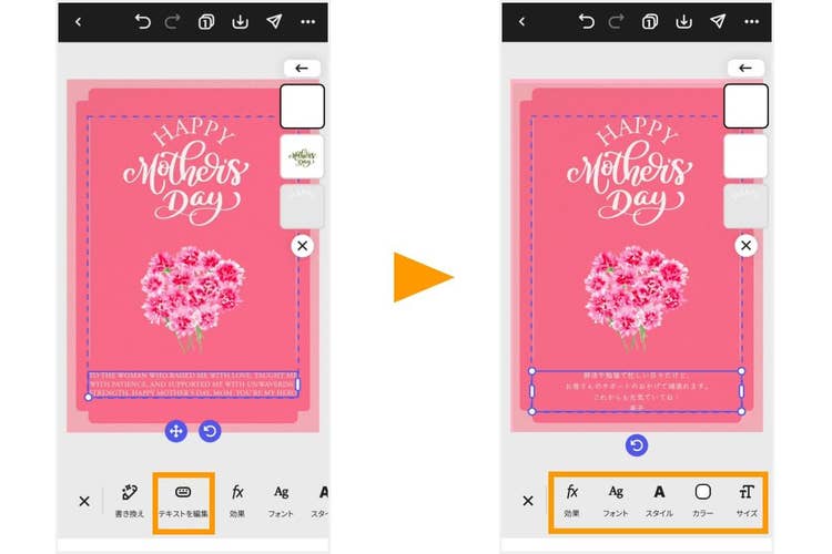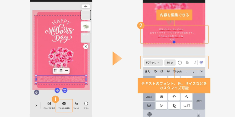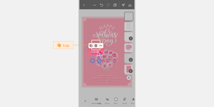 続いて、テンプレート内のテキストを編集して、お母さんへのメッセージを追加しましょう。