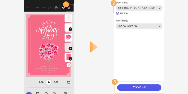 母の日カードが完成したら、ダウンロードのアイコンをタップし、ファイル形式を選んでから保存しましょう。