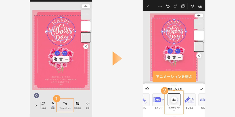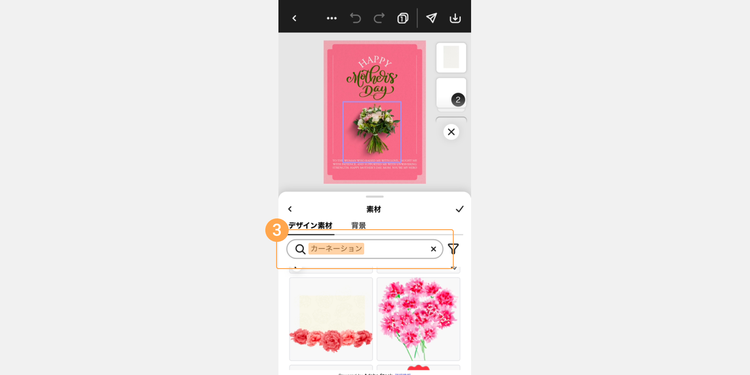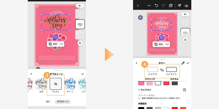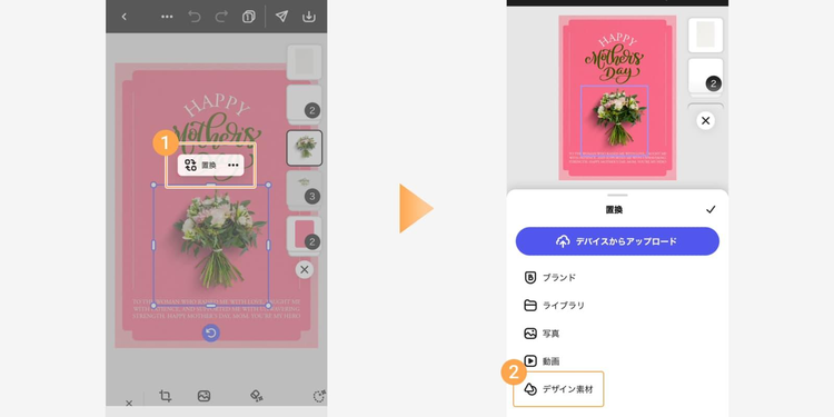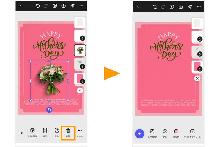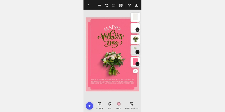 テンプレート内の素材を、お母さんの好きなモチーフや全体の色合いに合わせて変更しましょう。