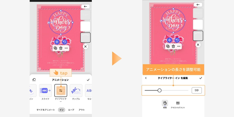 例えば、ふわっと文字が浮かび上がったり、花がやさしく揺れたりすると、カードを開いた瞬間の印象が一段と華やかになります。