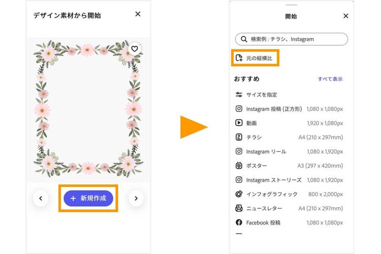 気に入ったフレームが見つかったら、「新規作成」をタップし、カードのサイズを指定します。