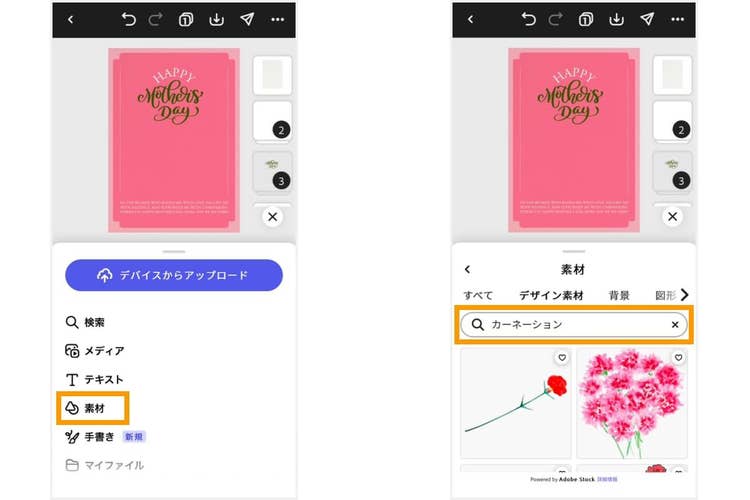 Adobe Expressには、豊富なデザイン素材が用意されているので、お母さんの好きなモチーフがきっと見つかります。