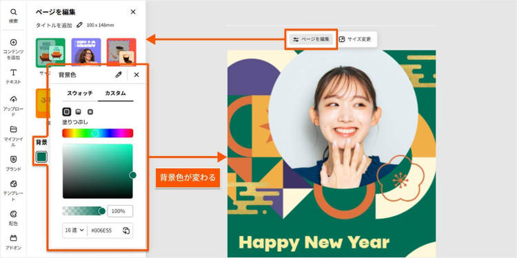 すると、「背景色」を選ぶポップアップが開くので、「スウォッチ」または「カスタム」タブから好みの色を選びます。今回は「カスタム」タブで「#006E55」を指定してみました。