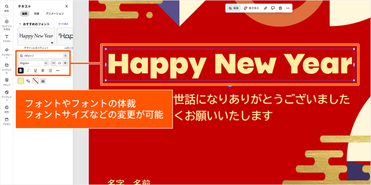 また、フォントの変更や色味の調整をしたい場合は、対象のテキストをクリックすると表示される、各種項目から変更が可能です。