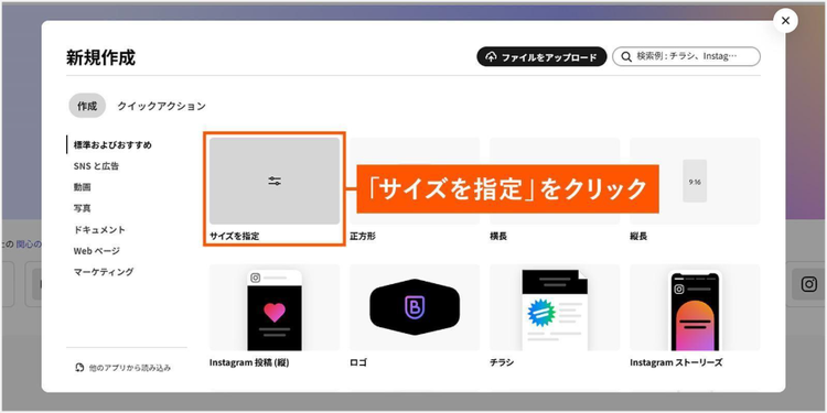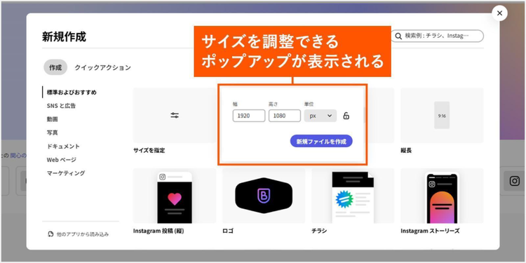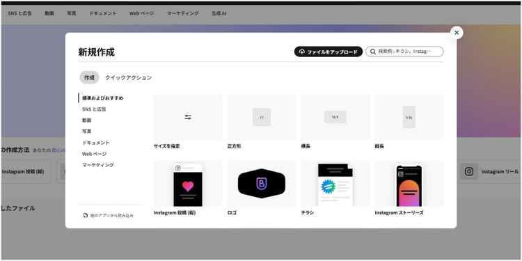Adobe Expressではカテゴリごとにフォーマットが用意されていて、「正方形(1:1)」「横長(16:9)」など様々なサイズを選択できます。