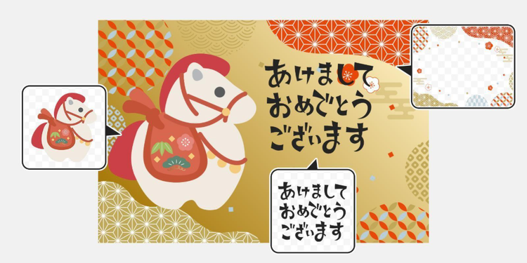 午年のモチーフを取り入れたり、想い出の写真に差し替えたりと、少し手を加えるだけで、ぐっと自分らしい一枚に近づきます。