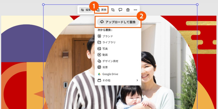 テンプレート内の背景画像を変更するには、既存の画像を選択すると表示される「置換」を選択します。