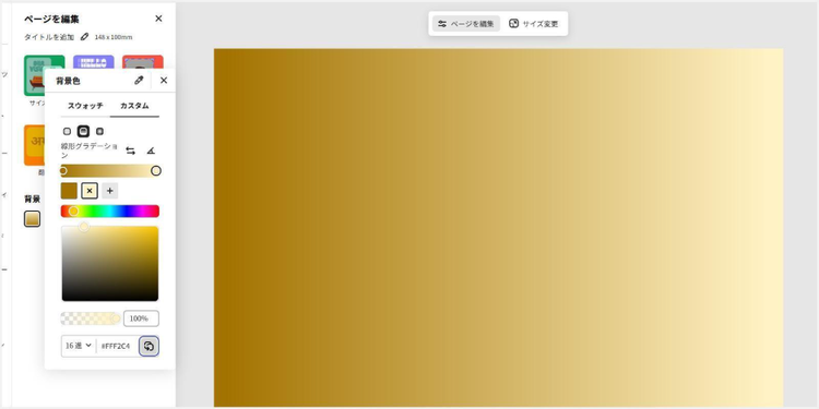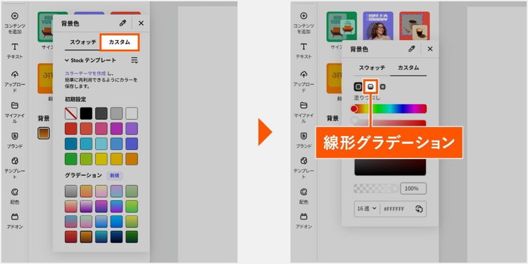 「背景色」を選ぶポップアップが表示されるので、「カスタム」をクリックし、「カスタム」タブ内の「線形グラデーション」ボタンを選択してください。