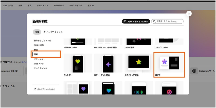 今回は年賀状なので「写真」カテゴリの中にある「はがき」サイズを選択してください。