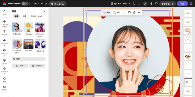 操作はシンプルなのに、仕上がりは本格的。Adobe Expressのテンプレートを選んで調整していく中で、「こうしたい」が自然と形になっていく感覚を味わえるはずです。