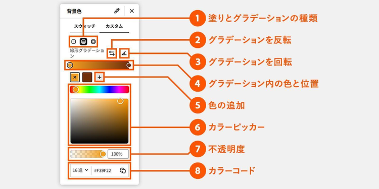 - グラデーション内の色と位置:グラデーション内で色が変わる位置の指定とその色を指定