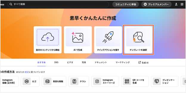 画面トップにある「テンプレートを選択」をクリックして、テンプレートの検索画面に移りましょう。