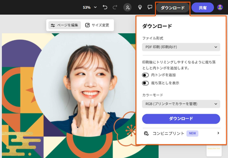 デザインの最終調整が済んだら、画面右上の「ダウンロード」をクリックし、ファイル形式を選んで画像をダウンロードしましょう。年賀状のように印刷をして使うケースが多い場合は「PDF印刷(印刷向け)」がオススメです。